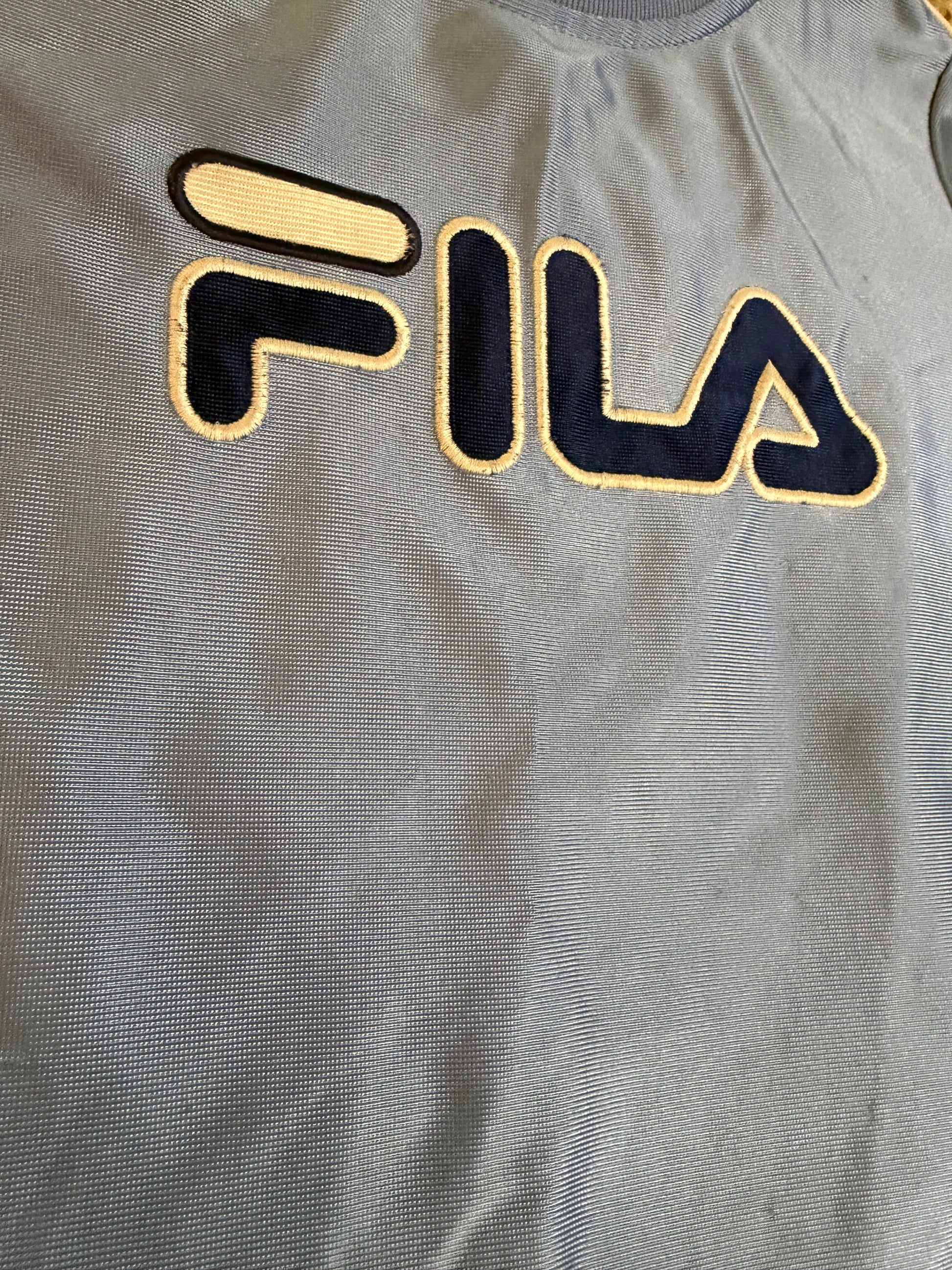 Sporty Vintage Y2K FILA short sleeve tee in ice blue with navy panels and piped seams. Classic raised logo at front—perfect for playground fits. Reminds me of 2000s BoyBands like Backstreet Boys, NSync, and even Spice Girls Sporty Spice!